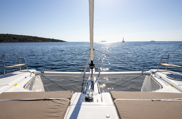 Katamaran oferuje bardzo funkcjonalny układ przestrzeni. Na pokładzie znajdziemy duży kokpit z miejscem do wspólnych posiłków, strefę wypoczynkową na dziobie oraz panoramiczne widoki z salonu dzięki dużym przeszkleniom.